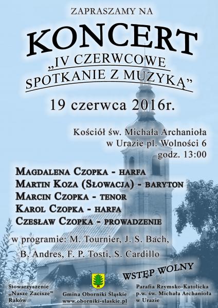 Serdecznie zapraszamy wszystkich chętnych na koncert pn. "IV czerwcowe spotkanie z muzyką", który odbędzie się 19 czerwca w kościele p.w. św. Michała Archanioła w Urazie