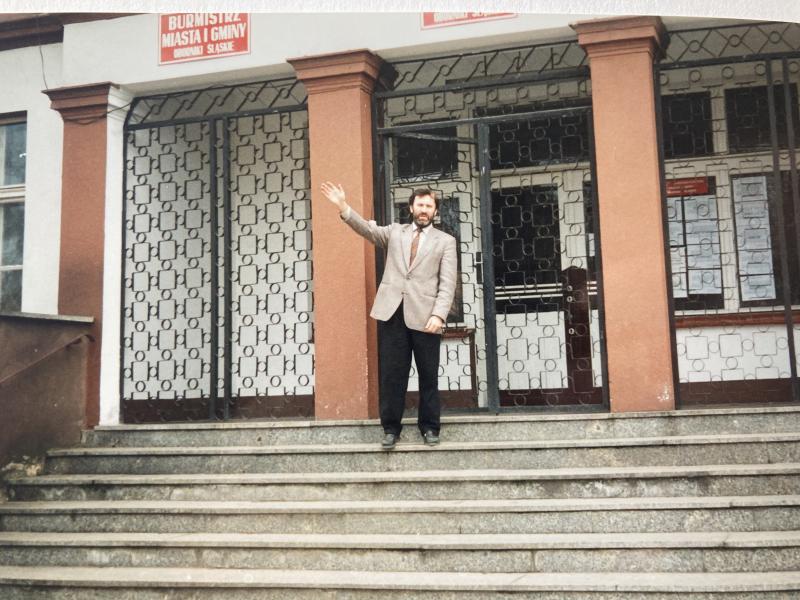 fot. 2 Ryszard Stadtmuller, pierwszy Burmistrz Miasta i Gminy Oborniki Śląskie, na schodach Urzędu Miasta