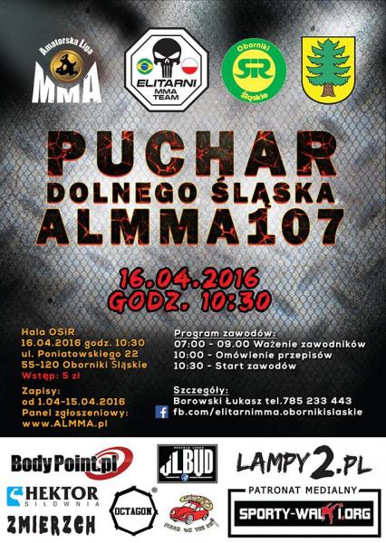 Zapraszamy wszystkich miłośników sportów walki na Puchar Dolnegośląska ALMMA 107, 16 kwietnia w sobotę do Ośrodka Sportu i Rekreacji. Emocje gwarantowane.