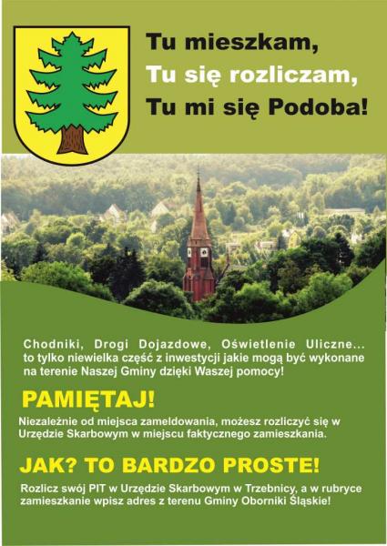 W związku z nadchodzącym okresem rozliczeń podatkowych, zwracamy się z prośbą do osób zamieszkałych na terenie Gminy Oborniki Śląskie, aby rozliczały się w Urzędzie Skarbowym w Trzebnicy i wskazały, jako miejsce zamieszkania teren Naszej Gminy, tj. Gminę Oborniki Śląskie, niezależnie od miejsca zameldowania.