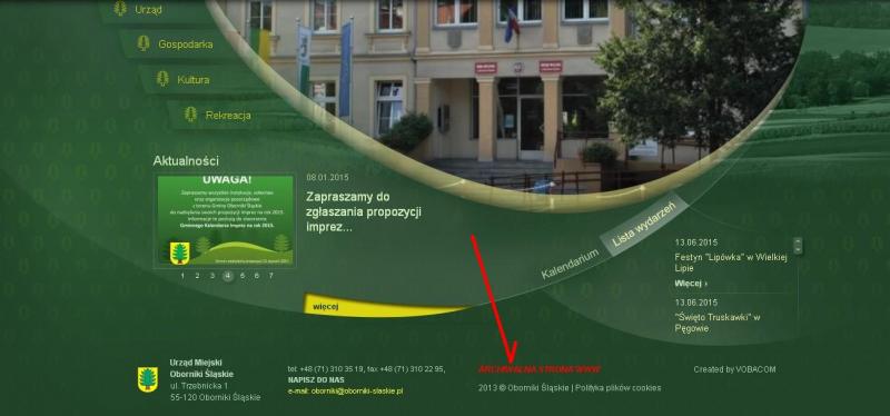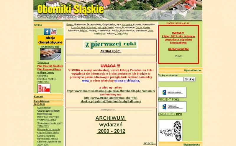 Na dole strony www.oborniki-slaskie.pl znajduje się link (w czerwonym kolorze ) do strony archiwalnej Obornik Śląskich. Jest to strona aktualnie działająca jako archiwum. Pamiętajmy, ze po wejściu na nią mamy dostęp do wiadomości archiwalnych od roku 2000. Są linki które mogą nie działać. Jeżeli klikają Państwo na link i wyświetla się informacja o braku podstrony lub błędzie to prosimy w pasku adresowym przeglądarki wpisać pomiędzy www a adres właściwy strona-archiwalna.