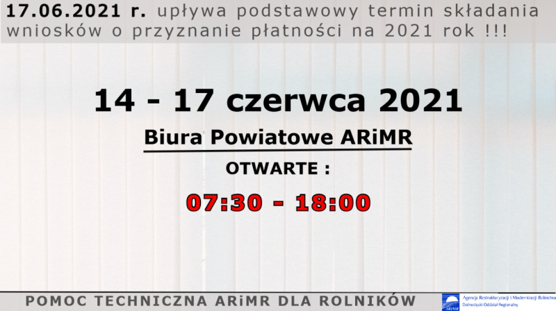 mając na uwadze zbliżający się termin zakończenia składania wniosków do biur powiatowych ARiMR o przyznanie płatności na rok 2021 (w terminie podstawowym), który upływa z dniem 17 czerwca 2021 r., ARMIR informuje, że w dniach 14 - 17 czerwca 2021 r. biura powiatowe ARMIR wydłużyły swój czas pracy, tj. od godziny 7:30 do godziny 18:00 w celu świadczenia rolnikom stosownej pomocy technicznej.