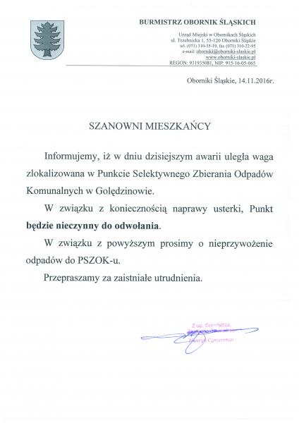 Szanowni Mieszkańcy! Informujemy, iż w dniu dzisiejszym tj. 14.11.2016 r. awarii uległa waga zlokalizowana w Punkcie Selektywnego Zbierania Odpadów Komunalnych w Golędzinowie. W zawiązku z koniecznością naprawy usterki punkt będzie nieczynny do odwołania.