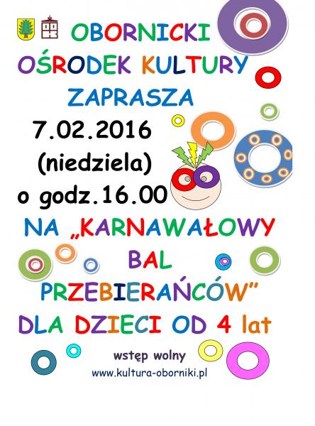 Wszystkie dzieci zapraszamy na bal karnawałowy do Obornickiego Ośrodka Kultury - wstęp bezpłatny
