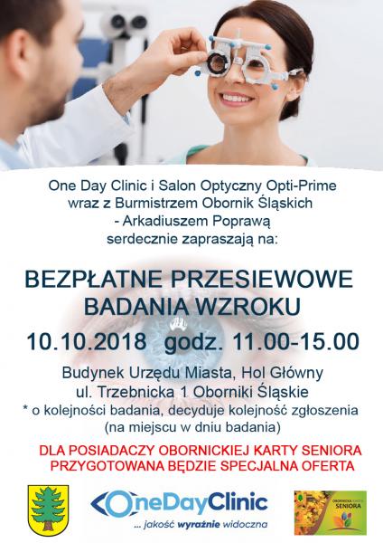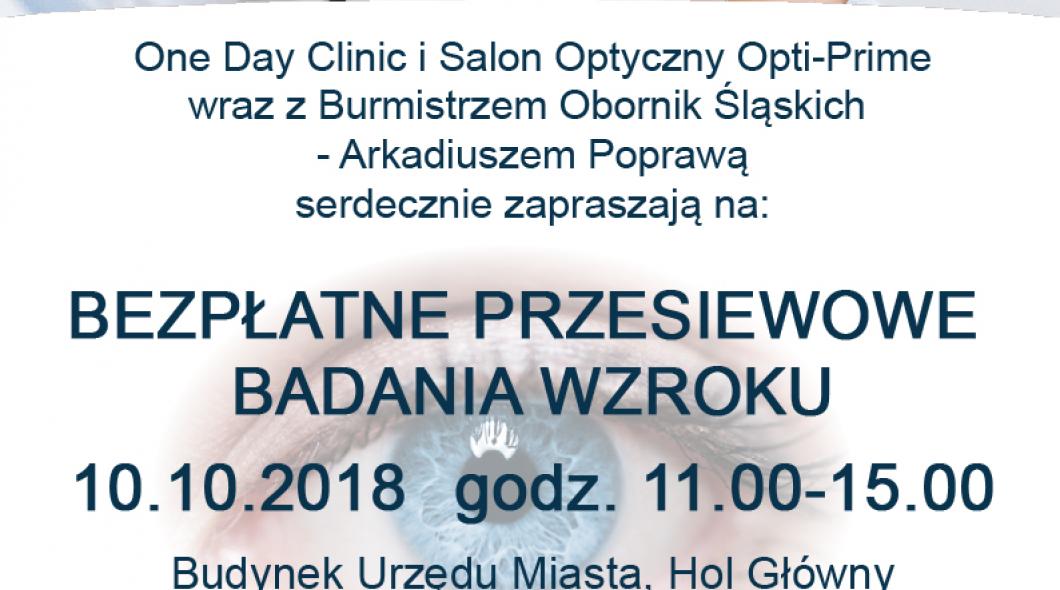 Burmistrz Arkadiusz Poprawa zaprasza 10 października na bezpłatne przesiewowe badania wzroku do holu Urzędu Miejskiego. Dla posiadaczy Obornickiej Karta Seniora zostanie przygotowana specjalna oferta! Zapraszamy