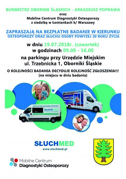 9Burmistrz Obornik Śląskich Arkadiusz Poprawa oraz Mobilne Centrum Diagnostyki Osteoporozy zapraszają na KOLEJNĄ edycję bezpłatnych badań w kierunku osteoporozy oraz słuchu osób powyżej 30 roku życia. Badania odbędą się 19.07.2018r. (czwartek ) w godzinach 09.00-16.00 na parkingu przy Urzędzie Miejskim. O kolejności badania decyduje kolejność zgłoszeń (na miejscu i w dniu badania).