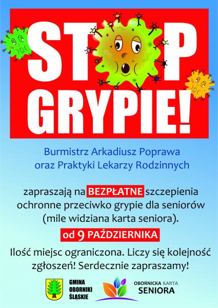 Burmistrz Obornik Śląskich Arkadiusz Poprawa oraz Praktyki Lekarzy Rodzinnych zapraszają na BEZPŁATNE szczepienia ochronne przeciwko grypie dla seniorów (mile widziana karta seniora). Od 9 października! Ilość miejsc ograniczona. Liczy się kolejność zgłoszeń! Serdecznie zapraszamy!