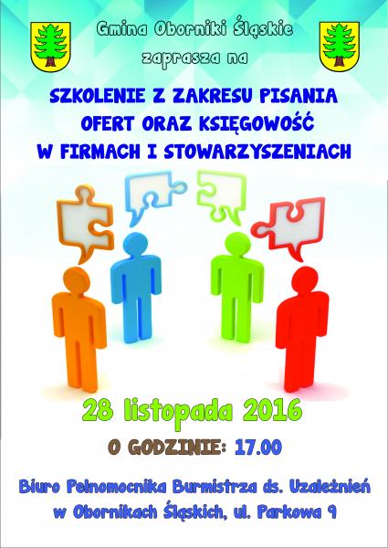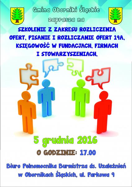 W związku z wejściem w życie nowego Rozporządzenia Ministra Rodziny, Pracy i Polityki Społecznej w sprawie wzorów ofert i ramowych wzorów umów dotyczących realizacji zadań publicznych oraz wzorów sprawozdań z wykonania tych zadań zapraszamy przedstawicieli wszystkich organizacji pozarządowych z terenu Gminy Oborniki Śląskie na szkolenia, które odbędą się 28 listopada oraz 5 grudnia w siedzibie Biura Pełnomocnika Burmistrza ds. Uzależnień w Obornikach Śląskich, ul. Parkowa 9