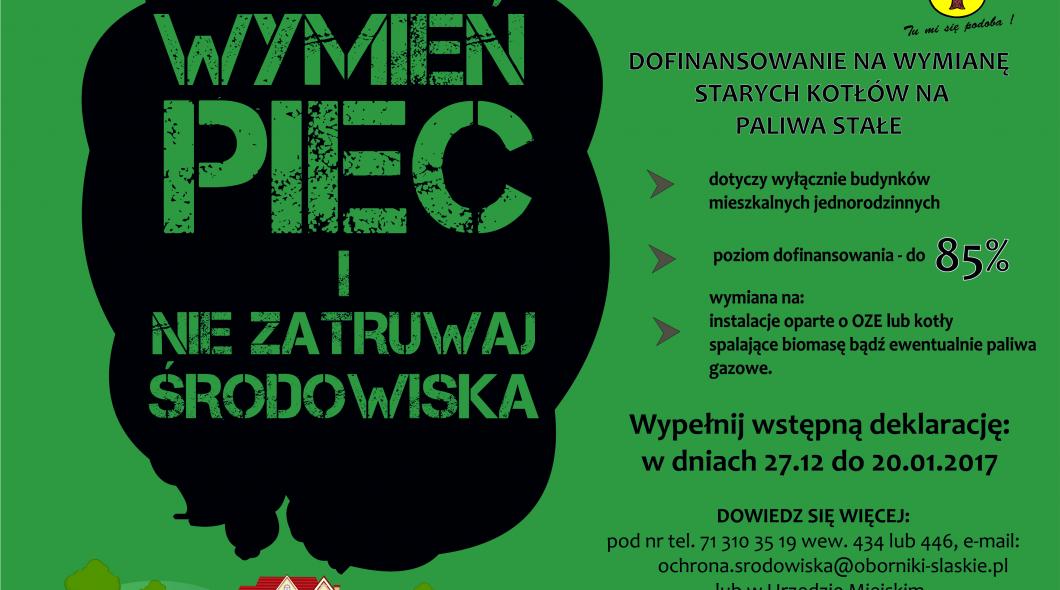 Informujemy, że gmina Oborniki Śląskie rozpoczyna przygotowania do pozyskania zewnętrznych środków finansowych na zadanie polegające na wymianie starych kotłów na paliwa stałe na instalacje źródeł ciepła opartych o odnawialne źródła energii (np. pompy ciepła) lub spalające biomasę (np. na pelet) lub paliwa gazowe (jedynie w uzasadnionych przypadkach wynikających z audytu energetycznego) w budynkach mieszkalnych jednorodzinnych. Wobec czego w dniach 27 grudnia 2016 r. – 20 stycznia 2017 r. przyjmowane będą deklaracje od osób zainteresowanych uczestniczeniem w przedmiotowym programie dofinansowania.