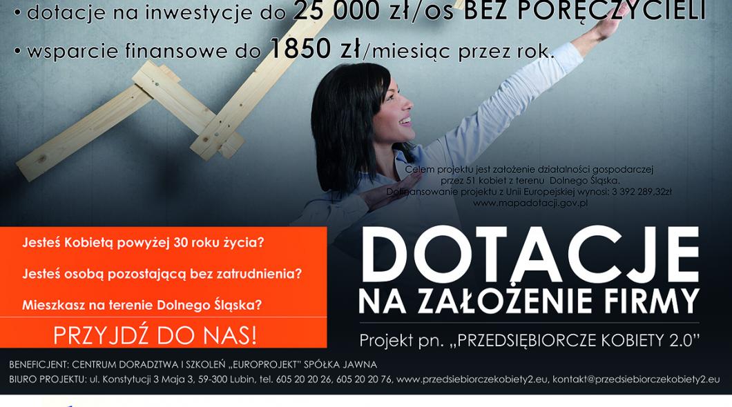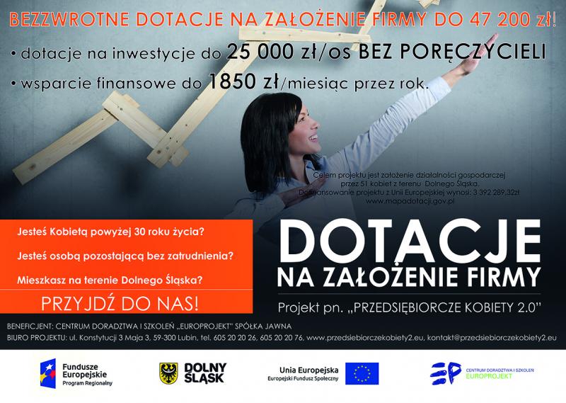 Jesteś kobietą powyżej 30 roku życia? Jesteś osobą pozostającą bez zatrudnienia? Masz szansę na otrzymanie bezzwrotnej dotacji na założenie firmy. Wartość dotacji może wynieść nawet do 47 200 zł!Więcej na stronie projektu www.przedsiebiorczekobiety2.eu