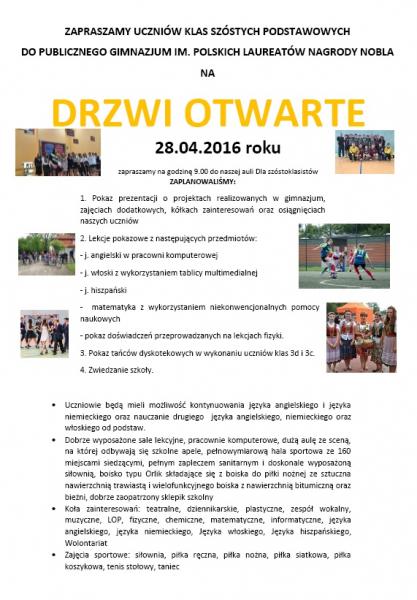 Zapraszamy uczniów klas szóstych wraz z rodzicami na drzwi otwarte do obornickiego gimnazjum już w najbliższy czwartek 28 kwietnia od godziny 9.00 rano.