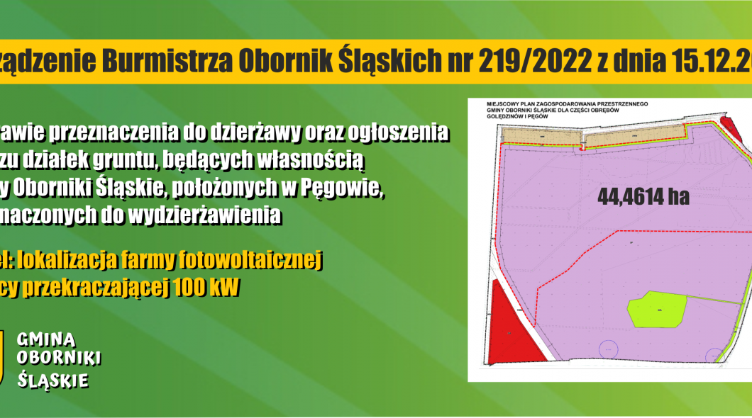 Dzierżawa działki pod farmę fotowoltaiczną o mocy przekraczającej 100 kW. Zarządzenie Burmistrza Obornik Śląskich nr 219/2022 z dnia 15.12.2022 r. w sprawie przeznaczenia do dzierżawy oraz ogłoszenia wykazu działek gruntu, będących własnością Gminy Oborniki Śląskie, położonych w Pęgowie, przeznaczonych do wydzierżawienia na cel: lokalizacja farmy fotowoltaicznej o mocy przekraczającej 100 kW.