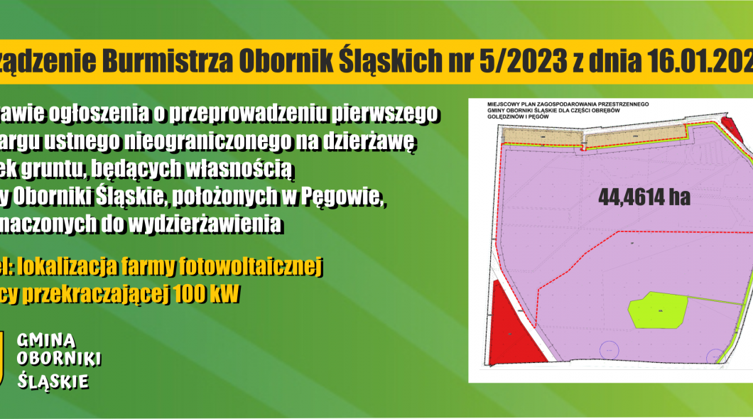 Dzierżawa działki pod farmę fotowoltaiczną o mocy przekraczającej 100 kW. Zarządzenie Burmistrza Obornik Śląskich nr 5/2023 z dnia 16.01.2023 r. w sprawie przeznaczenia do dzierżawy oraz ogłoszenia wykazu działek gruntu, będących własnością Gminy Oborniki Śląskie, położonych w Pęgowie, przeznaczonych do wydzierżawienia na cel: lokalizacja farmy fotowoltaicznej o mocy przekraczającej 100 kW.