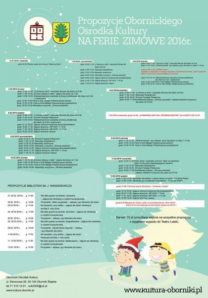 Ferie zimowe zbliżają się coraz większymi krokami, dlatego już dzisiaj zachęcamy do skorzystania z oferty Obornickiego Ośrodka Kultury, Ośrodka Sportu i Rekreacji oraz Akademii Pozytywki w Obornikach Śląskich. Szczegółowe informacje znajdziecie Państwo na stronach internetowych instytucji.