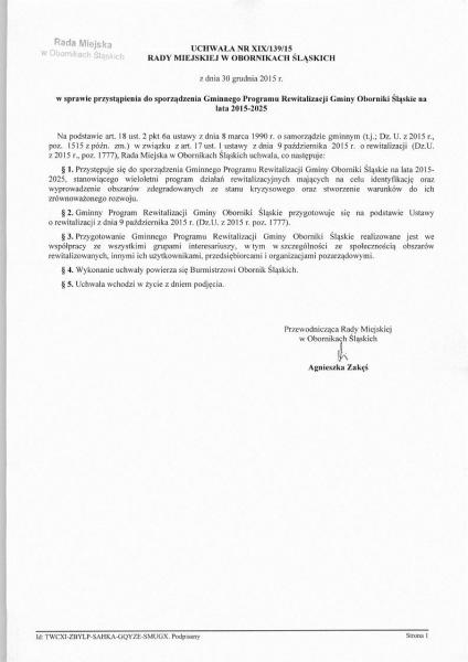 Rada Miejska w Obornikach Śląskich 30 listopada 2015 roku podjęła Uchwałę o przystąpieniu do sporządzania Gminnego Programu Rewitalizacji Gminy Oborniki Śląskie na lata 2015 - 2025, dzięku któremu Gmina będzie mogła starać się o dotacje unijne z Programów Operacyjnych na inwestycje zwiazane z rewitalizacją i zagospodarowaniem terenów i obiektów wyznaczonych w w/w Programie.