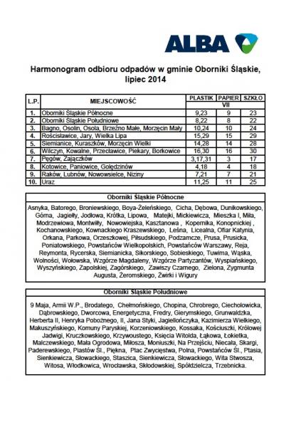 Harmonogram odbioru odpadów segregowanych z terenu Gminy Oborniki Śląskie | Oficjalny serwis Gminy Oborniki Śląskie