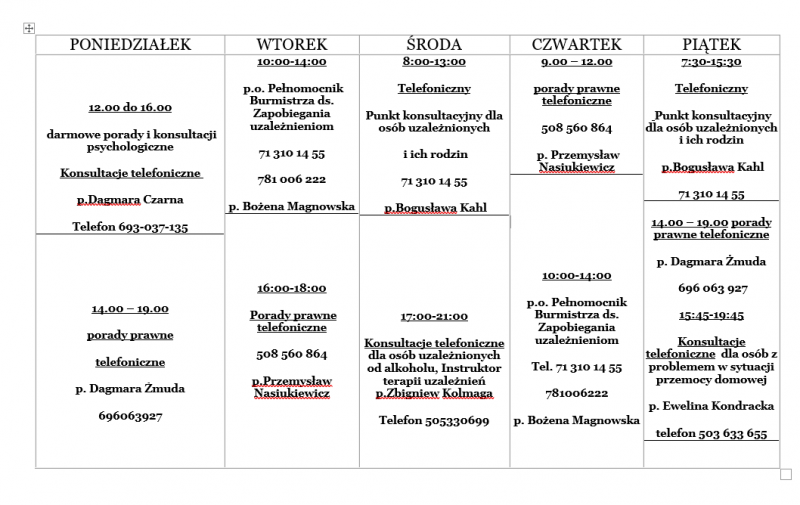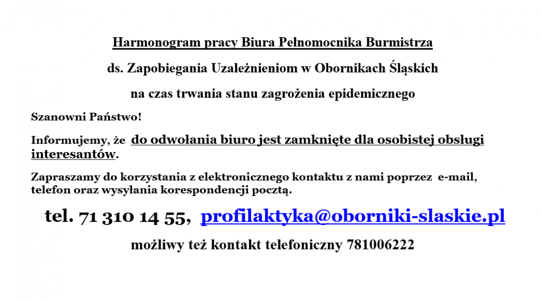 Harmonogram pracy Biura Pełnomocnika Burmistrza ds. Zapobiegania Uzależnieniom w Obornikach Śląskich na czas trwania stanu zagrożenia epidemicznego.