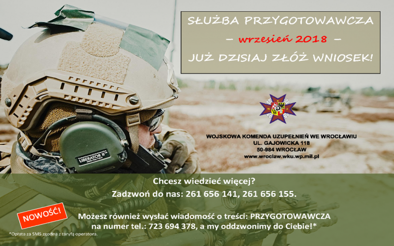 Wojskowa Komenda Uzupełnień we Wrocławiu informuje, iż rozpoczyna nabór na III Turnus Służby Przygotowawczej w 2018r.  Służba pełniona będzie na potrzeby korpusu szeregowych od września br.