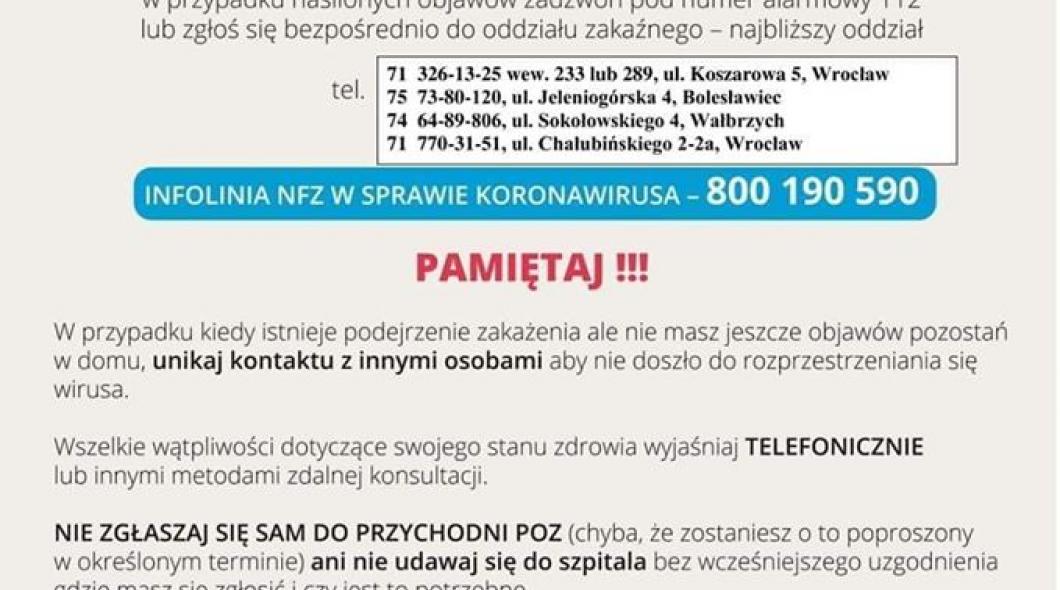 Prosimy zapoznać się z informacjami jak postępować w przypadku podejrzenia zarażeniem koronawirusem. Informujemy, iż na terenie Powiatu Trzebnickiego nie stwierdzono koronawirusa. Zachowajmy jednak szczególną ostrożność.