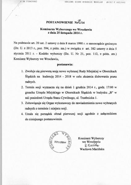 Zgodnie z POSTANOWIENIEM Nr 89/14 Komisarza Wyborczego we Wrocławiu z dnia 25 listopada 2014r. informuję, że na dzień 1 grudnia  2014r. godz. 1700 została zwołana I Sesja Rady Miejskiej w Obornikach Śląskich VII kadencji. Sesja odbywać się będzie w Urzędzie Miejskim, sala posiedzeń Urzędu Stanu cywilnego