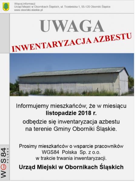 Informujemy, że w miesiącu listopadzie 2018 r. odbędzie się inwentaryzacja azbestu na terenie naszej gminy. Prosimy mieszkańców o wsparcie pracowników firmy WGS84 Polska Sp. z o.o. w trakcie trwania inwentaryzacji.