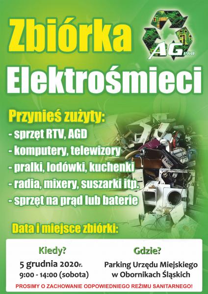 Szanowni Mieszkańcy ! Informujemy, że w dniu 5 grudnia 2020r. (sobota) w godz. od 9:00 do 14:00 na terenie Obornik Śląskich zostanie przeprowadzony bezpłatny odbiór zużytego sprzętu AGD i RTV*
