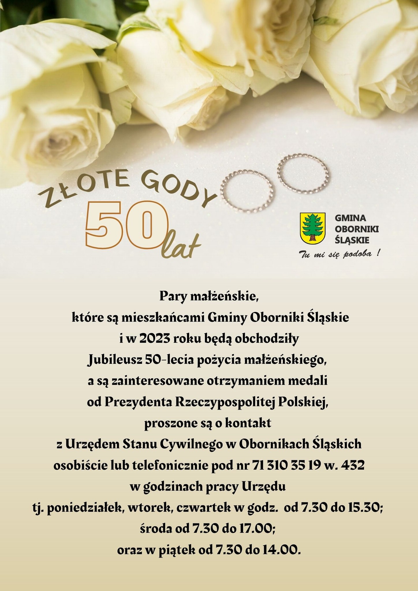 Pary małżeńskie, które są mieszkańcami Gminy Oborniki Śląskie i w 2023 roku będą obchodziły Jubileusz 50-lecia pożycia małżeńskiego, a są zainteresowane otrzymaniem medali od Prezydenta Rzeczypospolitej Polskiej, proszone są o kontakt z Urzędem Stanu Cywilnego w Obornikach Śląskich osobiście lub telefonicznie pod nr 71 310 35 19 w. 432 w godzinach pracy Urzędu tj. poniedziałek, wtorek, czwartek w godzinach od 7.30 do 15.30; środa od 7.30 do 17.00 oraz w piątek od 7.30 do 14.00