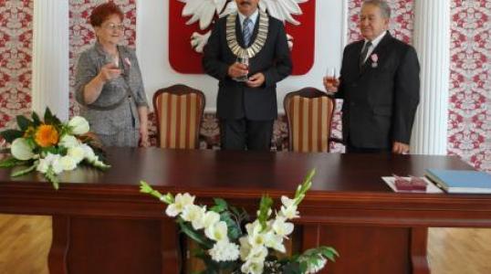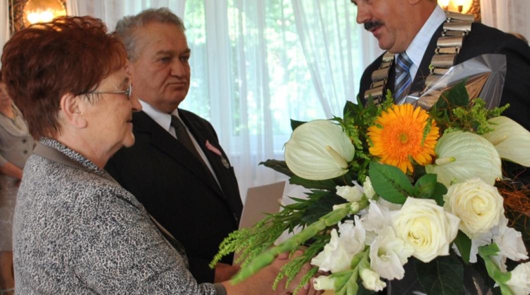 Burmistrz wręczył Jubilatom pamiątkowy list gratulacyjny oraz kwiaty, dziękując za wspaniały przykład trwałości małżeństwa szczególnie dla młodych, złożył życzenia kolejnych lat pomyślności w życiu rodzinnym.