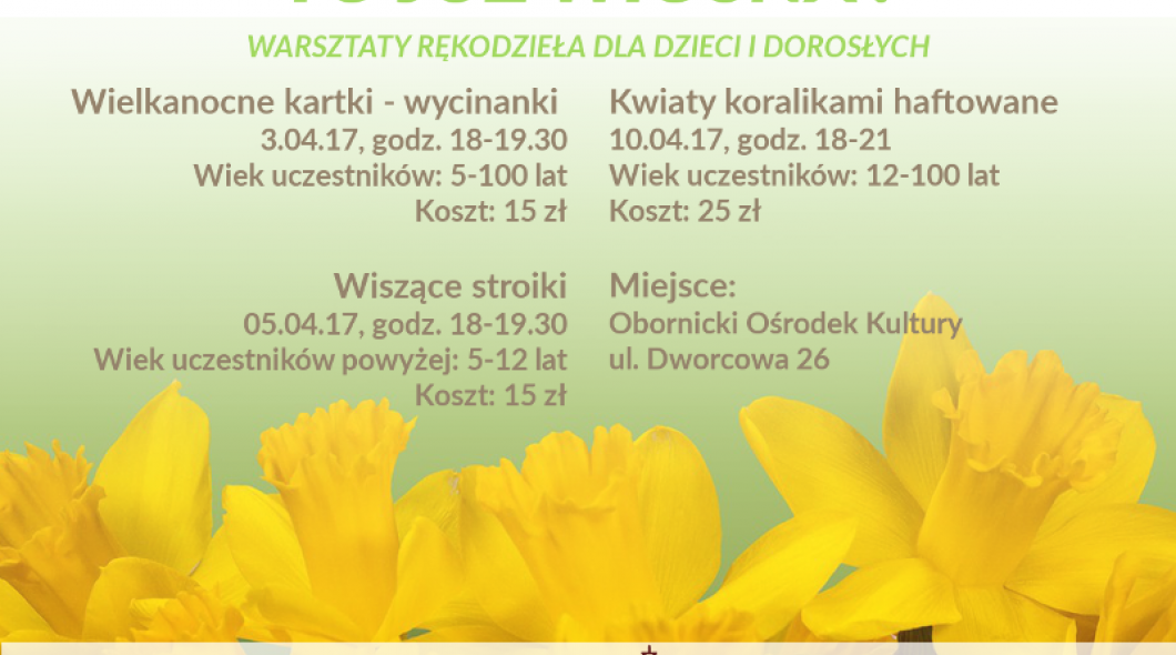 Obornicki Ośrodek Kultury wraz z Fundacją Raban zapraszają na warsztaty rękodzieła dla dzieci i dorosłych. W ramach zajęć odbędą się trzy spotkania na których uczestnicy będą tworzyć wielkanocne kartki - wycinanki, wiszące stroiki czy też kwiaty koralikami haftowane. Wszystki zajęcia odbędą się w Obornickim Ośrodku Kultury.