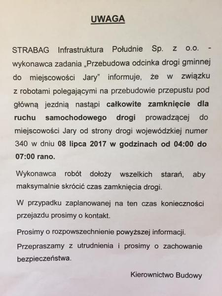 Informujemy, iż w związku z przebudową odcinka drogi gminnej do miejscowości Jary w dniu 8 lipca w godzinach od 04.00 do 07.00 nastąpi całkowite zamknięcie dla ruchu samochodowego drogi prowadzącej do miejscowości. Wykonawca dołoży wszelkich starań by maksymalnie skrócić czas zamknięcia drogi. W przypadku konieczności przejazdu służb przejazd zostanie przez pracowników udostępniony!
