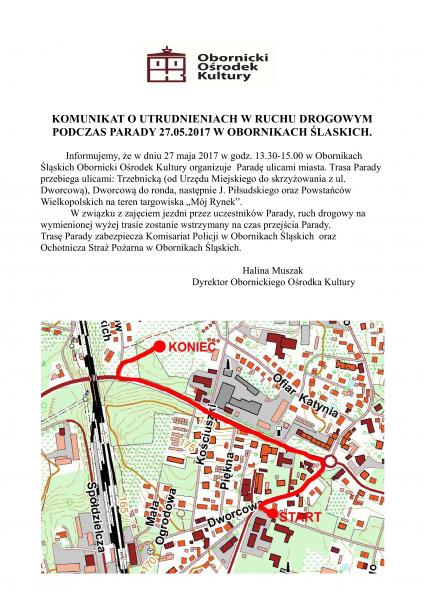 Informujemy, iż dnia 27 maja (sobota) w godzinach 13.00 - 14.00 zostanie zorganizowana przez Obornicki Ośrodek Kultury parada ulicami naszego miasta. Ze względu na zajęcie trasy przez uczestników marszu, ruch drogowy na wyżej wymienionej trasie zostanie wstrzymany.