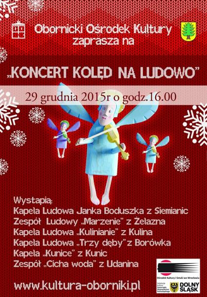 29 grudnia 2015 roku o godzinie 16.00 zapraszamy do Obornickiego Ośrodka Kultury na Koncert Kolęd na Ludowo w wykonaniu kapel ludowych: Kapeli Jana Boduszka z Siemianic, Zespołu Ludowego "Marzenie" z Żelazna, Kapeli Ludowej "Kulinianie" z Kulina, Kapeli Ludowej "Trzy Dęby" z Borówka, Kapeli "Kunice" z Kunic, Zespołu "Cicha Woda" z Udanina.