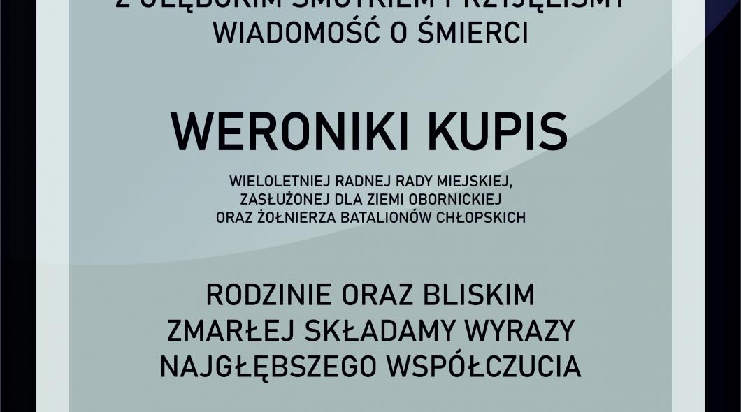 Z głębokim smutkiem przyjęliśmy wiadomość o śmierci Weroniki Kupis wieloletniej Radnej Rady Miejskiej, Zasłużonej dla Ziemi Obornickiej oraz żołnierza Batalionów Chłopskich. Rodzinie oraz bliskim zmarłej składamy wyrazy najgłębszego współczucia.