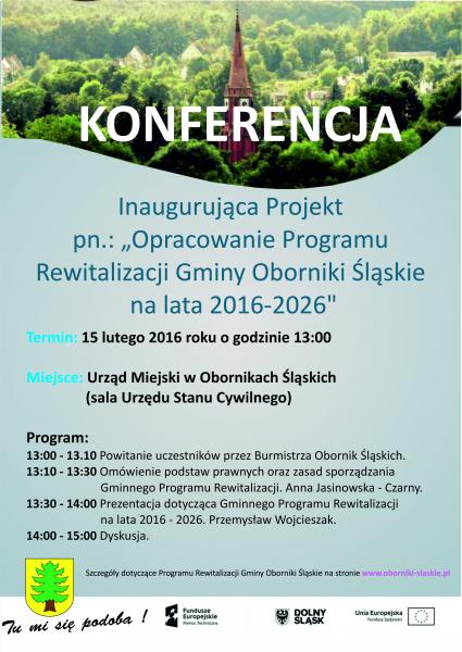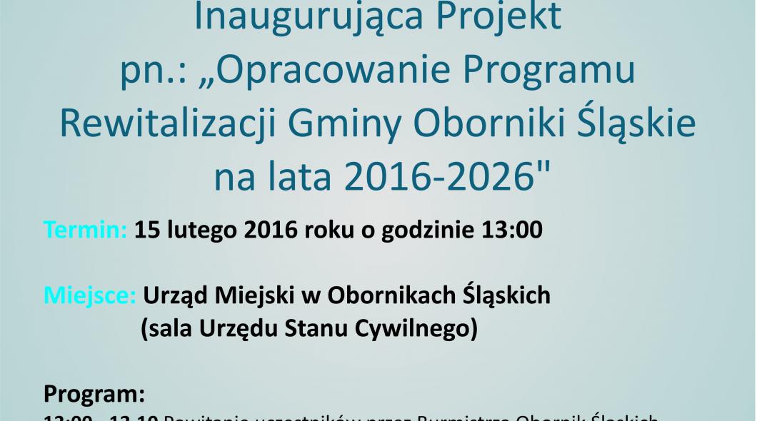 Burmistrz Obornik Śląskich Arkadiusz Poprawa zaprasza mieszkańców Gminy Oborniki Śląskie na Konferencję Inaugurującą Projekt "Program Rewitalizacji Gminy Oborniki Śląskie na lata 2016-2026", która odbędzie się 15 lutego 2016 roku w Sali Urzędu Stanu Cywilnego.