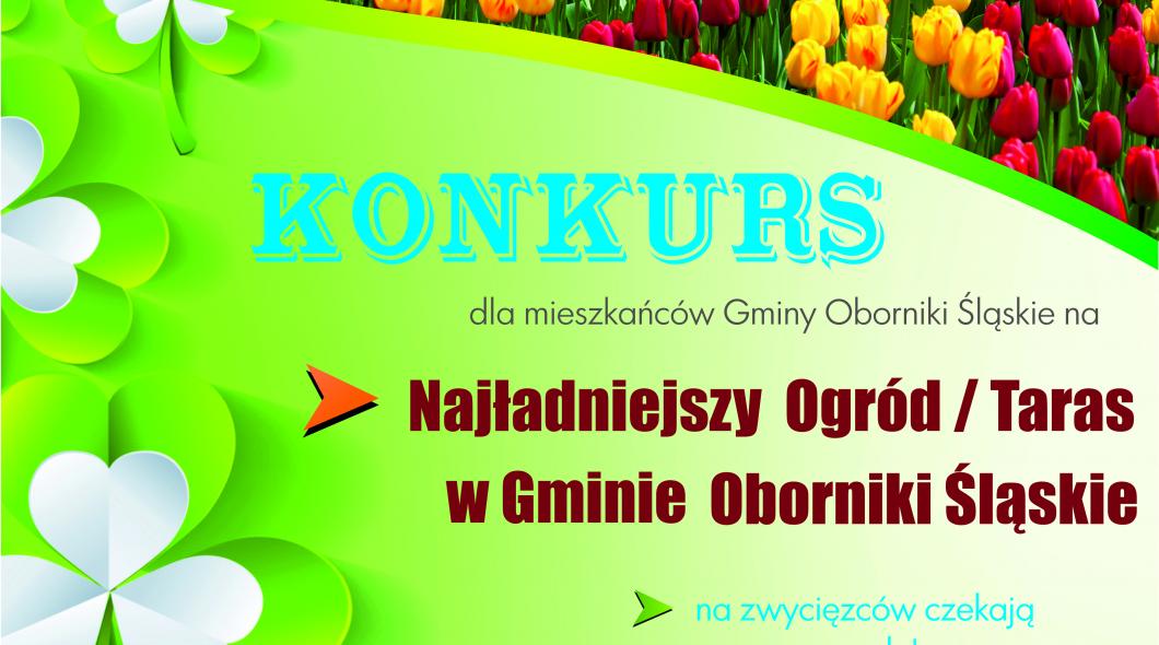 Burmistrz Obornik Śląskich Arkadiusz Poprawa ogłasza kolejną edycję konkursu na Najładniejszy Ogród/Taras z terenu Gminy Oborniki Śląskie. O nagrodę ubiegać się mogą wszystkie posesje położone na terenie Gminy Oborniki Śląskie. Zwycięzców konkursu wybierze specjalnie powołana przez Burmistrza Obornik Śląskich komisja konkursowa. Przyjmowanie zgłoszeń trwa do 31 maja 2017. Regulamin konkursu, karta zgłoszeniowa oraz oświadczenie o przetwarzaniu danych osobowych są dostępne w załączniku. W przypadku dodatkowych pytań prosimy o kontakt z Katarzyną Jarczewską – tel. 71/310 35 19 wew. 424
