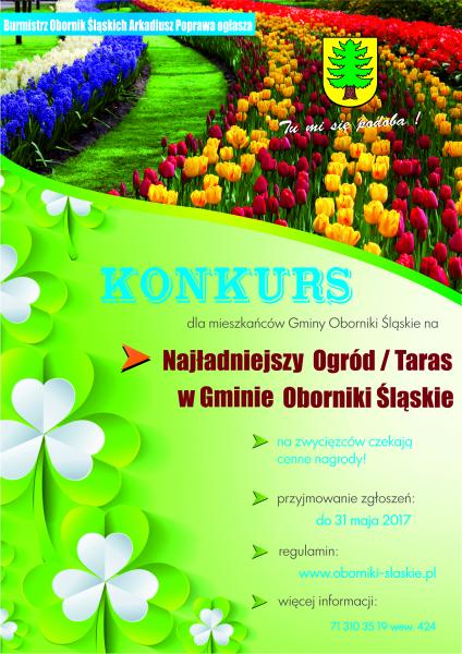 Burmistrz Obornik Śląskich Arkadiusz Poprawa ogłasza kolejną edycję konkursu na Najładniejszy Ogród/Taras z terenu Gminy Oborniki Śląskie. O nagrodę ubiegać się mogą wszystkie posesje położone na terenie Gminy Oborniki Śląskie. Zwycięzców konkursu wybierze specjalnie powołana przez Burmistrza Obornik Śląskich komisja konkursowa. Przyjmowanie zgłoszeń trwa do 31 maja 2017. Regulamin konkursu, karta zgłoszeniowa oraz oświadczenie o przetwarzaniu danych osobowych są dostępne w załączniku. W przypadku dodatkowych pytań prosimy o kontakt z Katarzyną Jarczewską – tel. 71/3103519 wew. 424