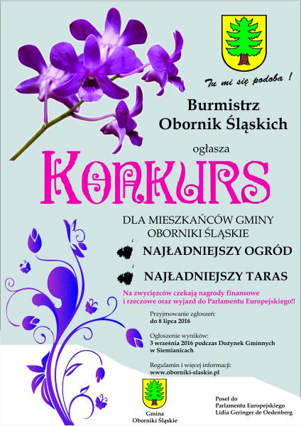 O nagrodę Burmistrza Obornik Śląskich ubiegać się mogą wszystkie posesje położone na terenie Gminy Oborniki Śląskie. Zwycięzców konkursu wybierze specjalnie powołana przez Burmistrza Obornik Śląskich Komisja Konkursowa. Zgłoszenia do konkursu należy przesyłać do 8 lipca 2016 roku na formularzu dostępnym w Urzędzie Miejskim ul. Trzebnicka 1 lub TUTAJ.