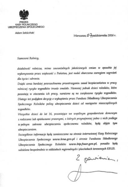 Więcej informacji na stronie: http://www.krus.gov.pl/aktualnosci/dokument/artykul/umowa-ubezpieczenia-dzieci-rolnikow-od-nastepstw-nieszczesliwych-wypadkow/
