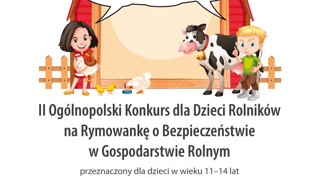 KRUS organizuje II Ogólnopolski konkurs dla dzieci rolników na rymowankę o bezpieczeństwie w gospodarstwie rolnym. Konkurs przeznaczony jest dla dzieci w wieku 11-14 lat. 20 najlepszych autorów zostanie uhonorowane nagrodami rzeczowymi o wartości ok 600 zł. Prace konkursowe należy przesyłać na adres mailowy: rymowanka@krus.gov.pl lub na Kasa Rolniczego Ubezpieczenia Społecznego, Biuro Prewencji al. Niepodległości 190, 00-608 Warszawa z dopiskiem "konkurs na rymowankę". Regulamin i wszystkie niezbędne dokumenty znajdują się w załączeniu.
