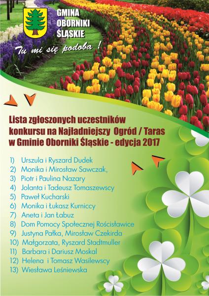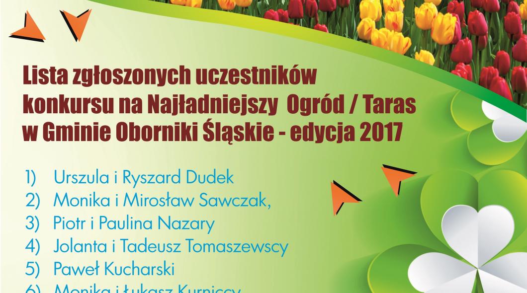 Szanowni Państwo, poniżej przedstawiamy listę zgłoszonych uczestników konkursu na Najładniejszy Ogród/Taras w Gminie Oborniki Śląskie.