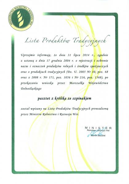 31 lipca 2014 roku zgodnie z ustawą o rejestracji i ochronie nazw i oznaczeń produktów rolnych i środków spożywczych oraz produktów tradycyjnych decyzją Ministra Rolnictwa i Rozwoju Wsi Pana Marka Sawickiego pasztet z królika ze szpinakiem został wpisany na Listę Produktów Tradycyjnych prowadzoną przez Ministerstwo. Warto wspomnieć, iż pasztet z królika ze szpinakiem wytwarzany w Morzęcinie Małym jest pierwszym Produktem Tradycyjnym w Gminie Oborniki Śląskie, a drugim w Powiecie Trzebnickim. Panu Henrykowi Nowakowskiemu z Gminy Trzebnica jako pierwszemu w Powiecie udało się zarejestrować jabłecznik trzebnicki w Ministerstwie Rolnictwa i Rozwoju Wsi.