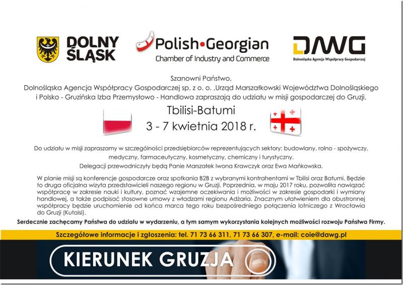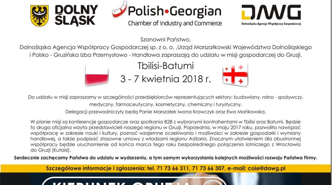 Szanowni Państwo, Dolnośląska Agencja Współpracy Gospodarczej (DAWG), Urząd Marszałkowski Województwa Dolnośląskiego (UMWD) i Polsko - Gruzińska Izba Przemysłowo - Handlowa zapraszają do udziału w misji gospodarczej do Gruzji. Tbilisi - Batumi 3-7 kwietnia 2018. Do udziału w misji zapraszamy w szczególności przedsięborców reprezentujących sektory: budowlany, rolno - spożywczy, medyczny, farmaceutyczny. kosmetyczny, chemiczny i turystyczny. Delegacji przewodniczyć będą Panie Marszałek Iwona Krawczyk oraz Ewa Mańkowska. W planie misji są konferencje gospodarcze oraz spotkania B2B z wybranymi kontrahentami w Tbilisi i Batumi. Szczegółowe informacje i złoszenia pod nr tel.: 71 73 66 311, 71 73 66 307, email: coie@dawg.pl