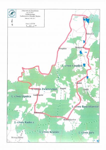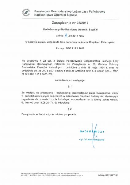 Poniżej Zarządzenie nr 22/2017 Nadleśniczego Nadleśnictwa Oborniki Śląskie wraz z załącznikiem mapowym wskazującym lokalizację obszaru objętego zakazem.