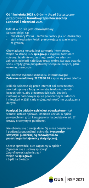 Od 1 kwietnia 2021 Główny Urząd Statystyczny przeprowadza Narodowy Spis Powszechny Ludności i Mieszkań. Udział w spisie jest obowiązkowy. Spisem objęci zostaną mieszkańcy Polski - Polacy oraz cudzoziemcy oraz stali mieszkańcy Polski przebywający w czasie spisu za granicą. Więcej informacji na stronie spis.gov.pl