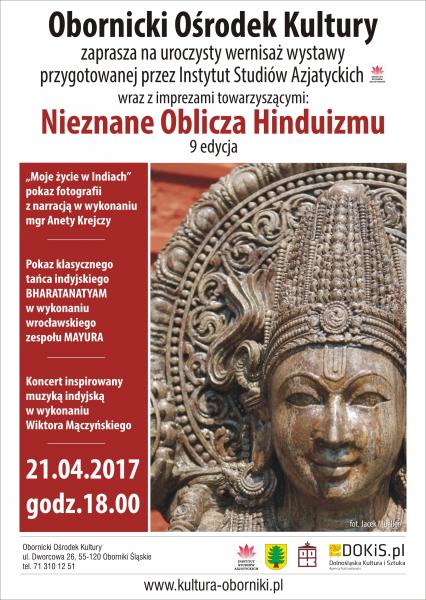 Obornicki Ośrodek Kultury zaprasza na uroczysty wernisaż wystawy przygotowanej przez Instytut Studiów Azjatyckich pt. Nieznane Oblicza Hinduizmu. Rozpoczęcie wernisażu 21 kwietnia 2017 r. o godzinie 18.00.  Podczas spotkania zostanie przedstawiony pokaz zdjęć wraz z narracją, pokaz klasycznego tańca indyjskiego oraz koncert inspirowany muzyką indyjską.