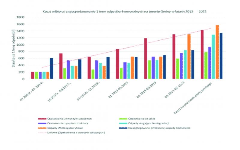 W ostatnim czasie Gmina zmaga się z rosnącymi kosztami utrzymania, które niestety nie ominęło również kosztów odbioru i zagospodarowania odpadów komunalnych. Rosnące koszty paliwa, płacy minimalnej, wzrost cen za zagospodarowanie odpadów w instalacjach, gdzie przewożone są odpady zebrane z terenu naszej Gminy oraz ciągły wzrost ilości produkowanych odpadów sprawiły, że wzrosły koszty związane z gospodarką odpadami. W przypadku odpadów frakcji plastiku stawka 1 tony odpadu wzrosła ze stawki 864,00 zł brutto w roku 2019 do 1 425,00 zł brutto w roku 2022, a w przypadku odpadów ulegających biodegradacji ze stawki 550,18 zł brutto w roku 2019 do 1 288,82 zł brutto w 2022 roku.