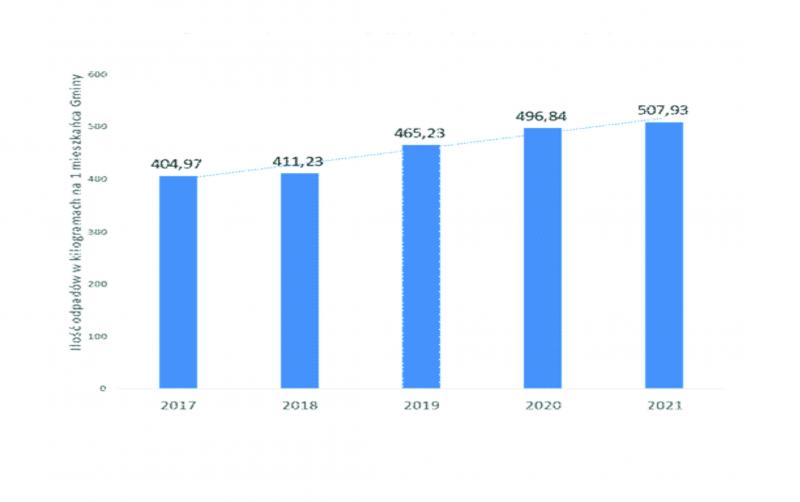 Na podstawie przeprowadzonych analiz wynika, że Mieszkańcy Gminy produkują coraz więcej odpadów w przeliczeniu na 1 mieszkańca. Niestety jesteśmy liderem wśród Gmin w powiecie trzebnickim. W 2021 roku ilość ta wyniosła 507,93 kg na osobę, gdzie zgodnie z danymi GUS-u statystyczny Polak wytworzył w 2021 roku 358 kg (tabela poniżej).