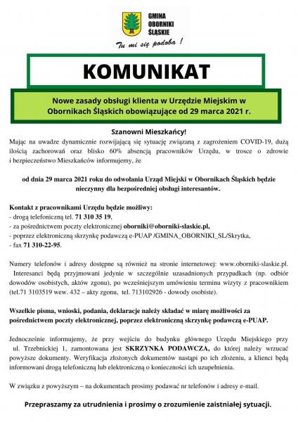 Mając na uwadze dynamicznie rozwijającą się sytuację związaną z zagrożeniem COVID-19, dużą ilością zachorowań oraz blisko 60% absencją pracowników Urzędu, w trosce o zdrowie i bezpieczeństwo Mieszkańców informujemy, że od dnia 29 marca 2021 roku do odwołania Urząd Miejski w Obornikach Śląskich będzie nieczynny dla bezpośredniej obsługi interesantów.