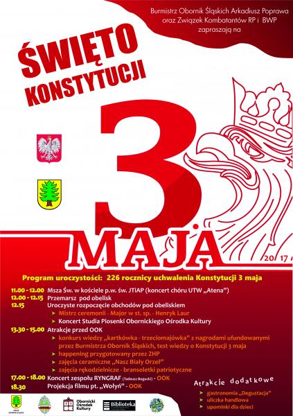 Burmistrz Obornik Śląskich Arkadiusz Poprawa oraz Związek Kombatantów RP i BWP zapraszają na obchody 226 rocznicy uchwalenia Konstytucji 3 maja. Oprócz corocznej mszy św. za Ojczyznę oraz apelu pod obeliskiem, będzie można wysłuchać koncertu patriotycznego w wykonaniu zespołu Ryngraf, a po koncercie obejrzeć film Wołyń. To wszystko w Obornickim Ośrodku Kultury.