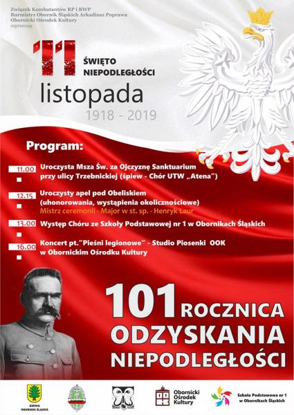 Związek Kombatantów RP i BWP, Burmistrz Obornik Śląskich oraz Obornicki Ośrodek Kultury zapraszają na obchody Święta Niepodległości. W programie: Msza Św. za Ojczyznę, Uroczysty apel pod obeliskiem, występ chóru ze Szkoły Podstawowej nr 1 oraz Koncert "Pieśni Legionowych.
